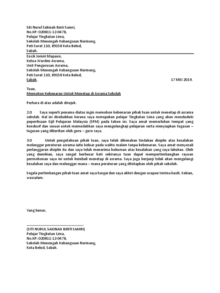 Download View Contoh Surat Rayuan Penempatan Asrama as PDF for free. Contoh Surat Memohon Kebenaran Keluar Asrama. Cyrillyne Mark Madinah Kampung Mempakad Laut Peti Surat 441 89107 Kota Marudu Sabah.